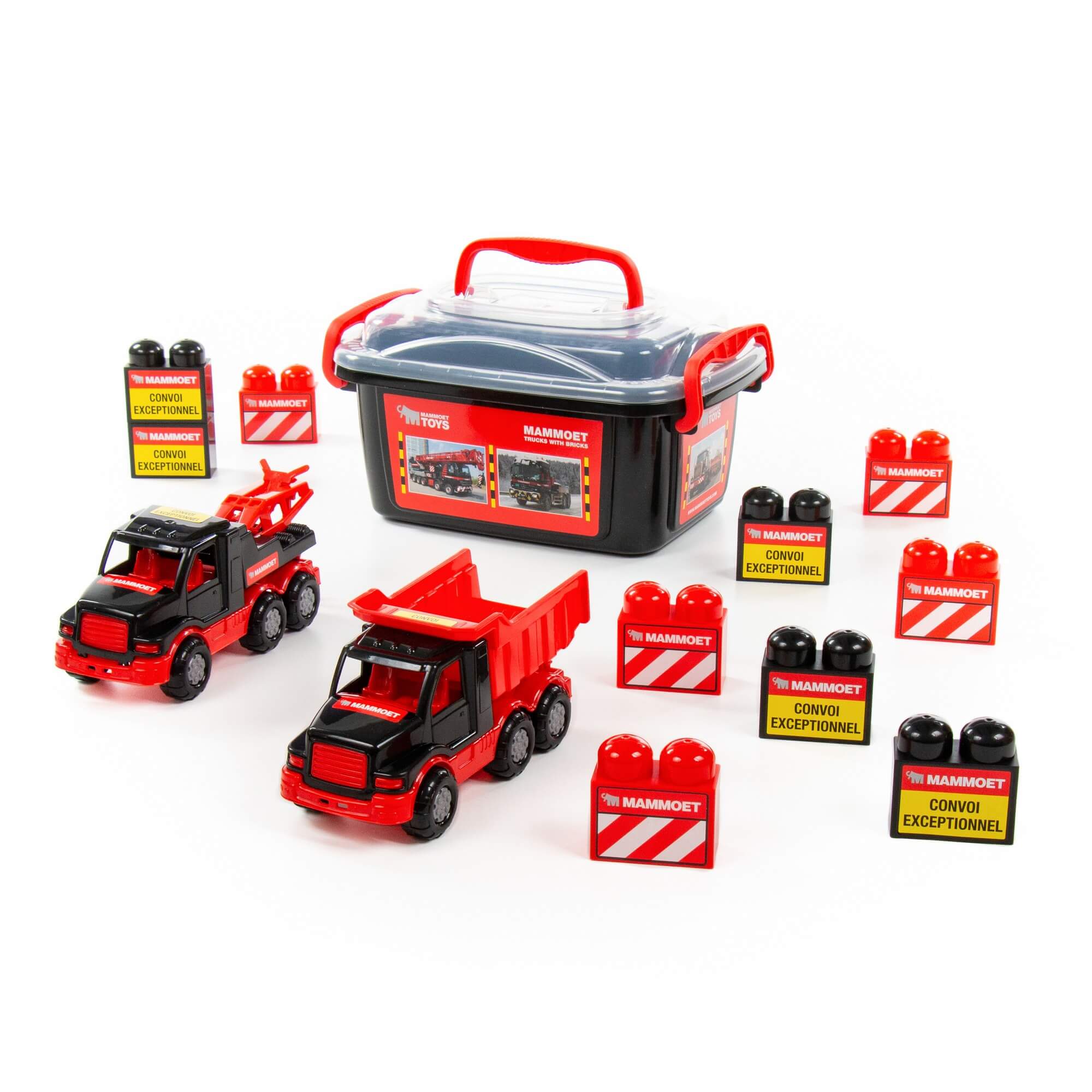 Комплект содержит: самосвал с подъемным бортом и эвакуатор с крюком для захвата, 10 различных элементов конструктора с крупными пазами и наклейками, а так же контейнер с крышкой и ручкой для удобства хранения.