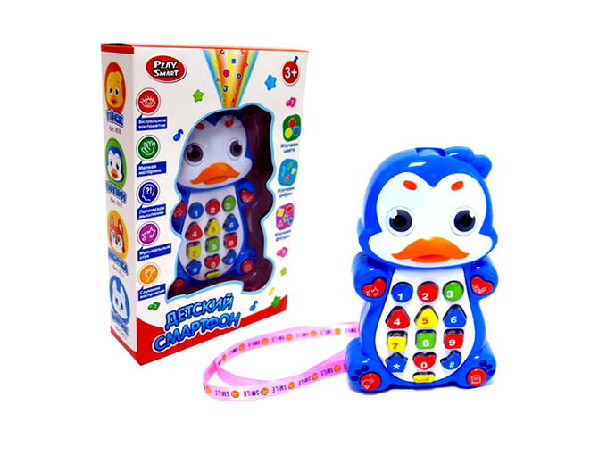 Игрушка-проектор Play Smart смартфон Пингвинчик (свет+звук) подарит радость и восторг вашему малышу. Яркий, в меру громкий, кнопки расположенные на дисплее легко нажимаются, все активны и отвечают каждая за свою функцию. Забавный утенок споет и прочитает шесть песен и стишков, еще расскажет о цветах, выучит с малышом цифры, буквы и разные фигуры, показывая в режиме проектора в темноте, на потолке или на стене. Можно использовать как ночник. Благодаря прочному пластику, не надо переживать, если ребенок уронит игрушку, она выдержит. Прекрасный подарок для развития в игровой форме.