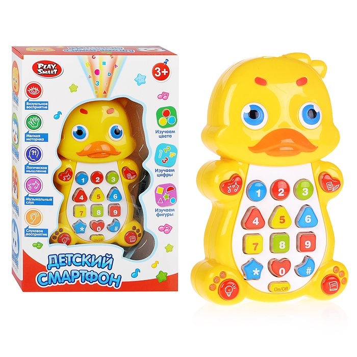 Оригинальный телефон предназначен для активных игр и развития мелкой моторики и координации движений. Яркая расцветка и забавная форма привлекут малыша. Игрушка учит пониманию причинно-следственной связи, помогает тренировать моторику и координацию движений, восприятие формы и цвета. Музыкальный телефон содержит песенки и сказки и обучит малышей счету, цветам и фигурам. Также имеется проектор, чтобы воспроизводить изображение на стене.
