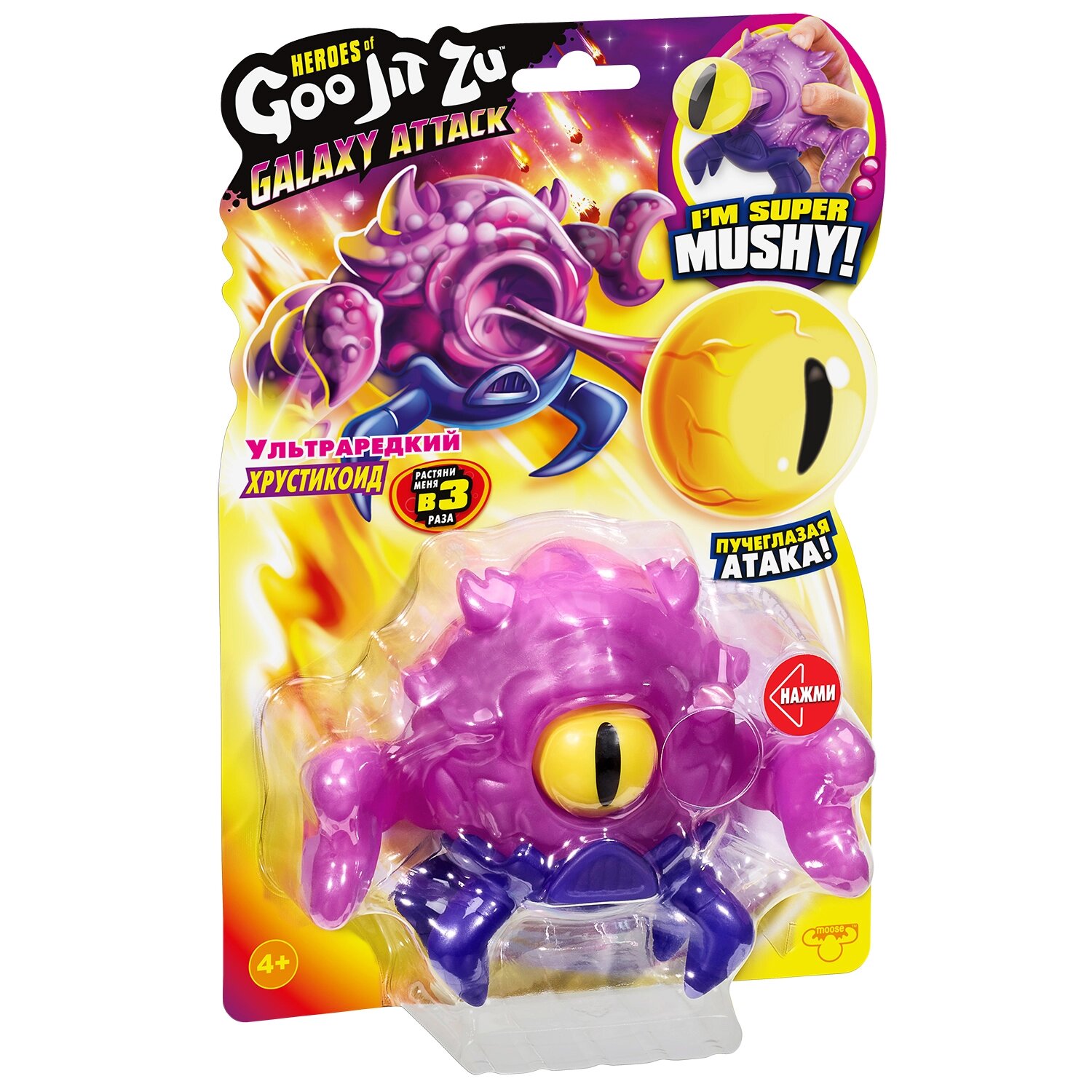 Тянущаяся фигурка Хрустикоид Гуджитсу приятна на ощупь, растягивается в 3 раза. Фигурка высотой 10,5 см наполнена полимерной массой с маленькими шариками. Глаз Хрустикоида выдвигается при сжатии фигурки.