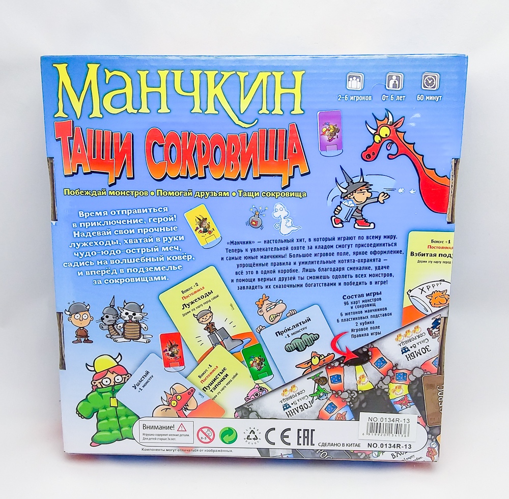 Комплектация: игровое поле; 96 карт монстров и сокровищ; 6 жетонов манчкинов; 6 пластиковых подставок; 2 кубика; правила игры.