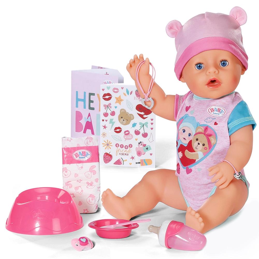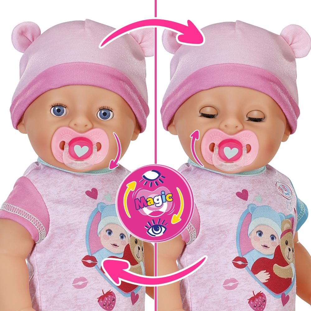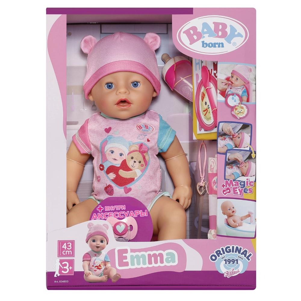 Куклы Беби Борн знакомы каждому из нас с самого детства! Играть в дочки-матери с Беби Борн никогда не станет скучно! Кукла Беби Борн — это не только пупс, за которым нужно ухаживать, но и прекрасный компаньон для больших приключений. Познакомьтесь с куклой Беби Борн “Эмма. Магические глазки”, ее размер 43 см! На улице еще светло и Эмма никак не хочет спать? Просто поверни пустышку во рту, и глазки закроются, в каком бы положении ни находилась малышка. У куклы 10 интерактивных функций: закрывает глаза, если повернуть во рту куклы соску, спит с закрытыми глазами, умеет пить из бутылочки, плачет настоящими слезами, писает в подгузник и в горшок, умеет есть с ложечки, можно купать, суперподвижная, быстрее сохнет.