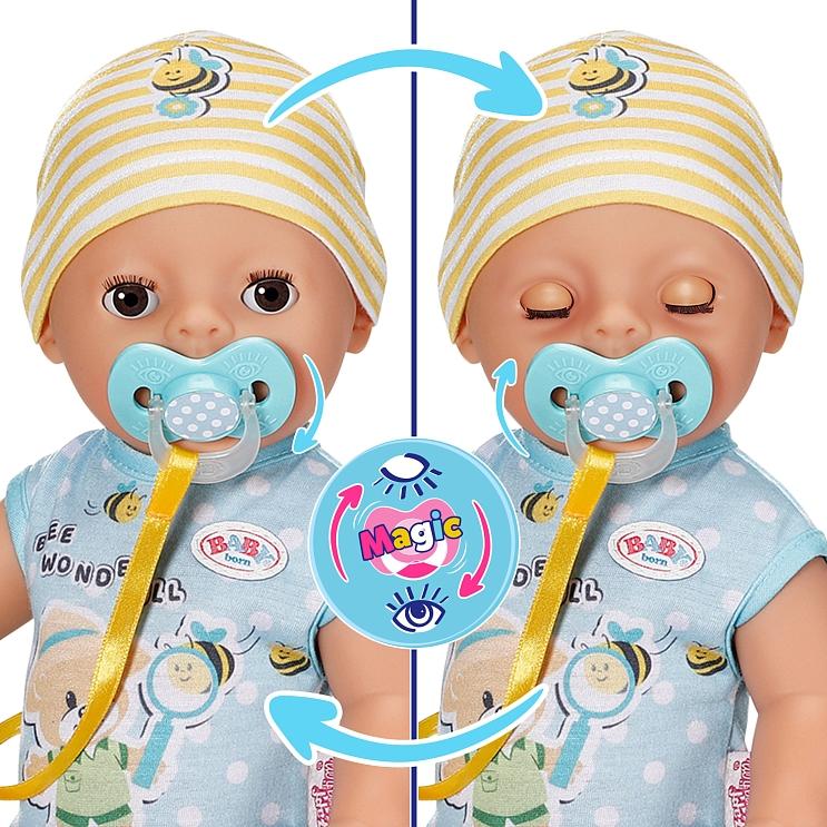 Куклы Беби Борн знакомы каждому из нас с самого детства! Играть в дочки-матери с Беби Борн никогда не станет скучно! Кукла Беби Борн — это не только пупс, за которым нужно ухаживать, но и прекрасный компаньон для больших приключений. Познакомьтесь с куклой Беби Борн “Лукас Магические глазки”, его размер 36 см! На улице еще светло и Лукас никак не хочет спать? Просто поверни пустышку во рту, и глазки закроются, в каком бы положении ни находился малыш. У куклы 7 интерактивных функций: