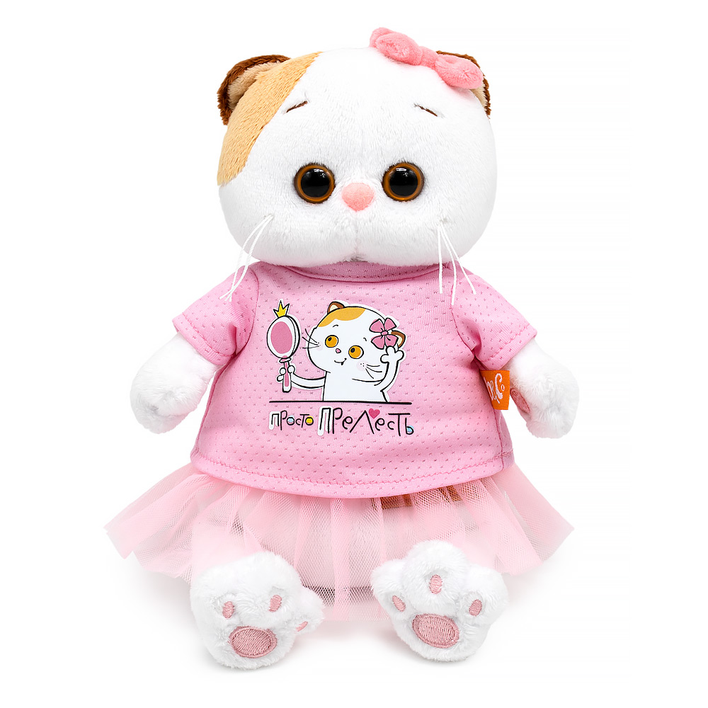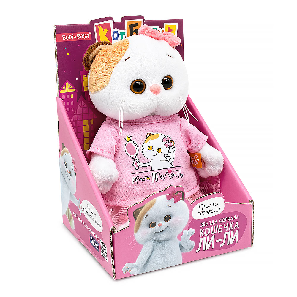 Кошечка Ли-Ли в классной футболке из спортивного трикотажа цвета розовой карамели. Спереди футболка украшена авторским принтом с надписью «Просто прелесть». Также на Ли-Ли пышная юбочка из розового фатина. На ушке розовый бантик из софта. Кошечка Ли-Ли представлена в фирменной коробке с дизайном в стиле мультсериала «Кот Басик».