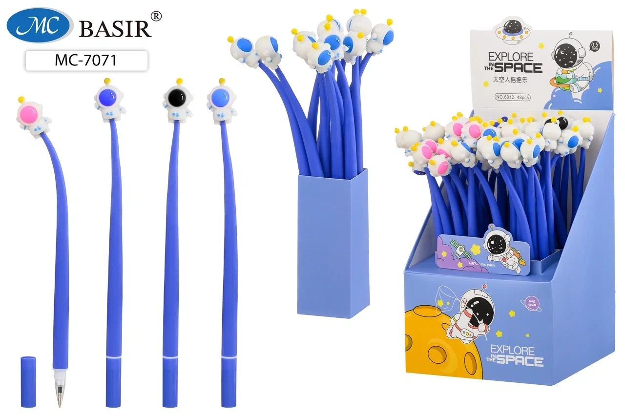 МС-7071 Ручка шариковая: детская; «КОСМОНАВТ»; гибкий прорезиненный цветной корпус /ассорти/, накончник-космонавт, 0,5 mm, цвет чернил-синий.