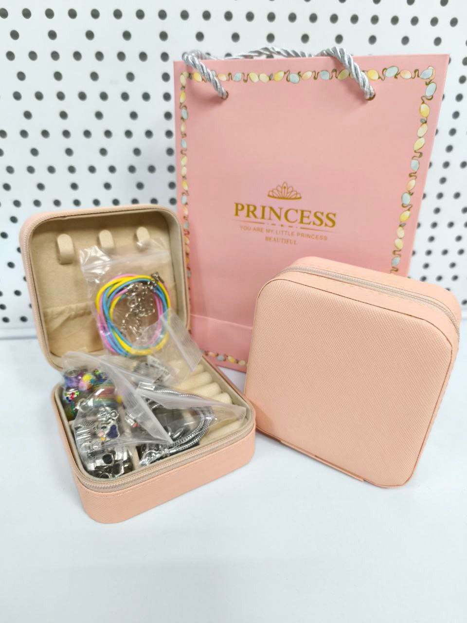 Детские украшения и аксессуары упакованы в красивую шкатулку-футляр на молнии, что делает её компактной и легкой для хранения и переноски.