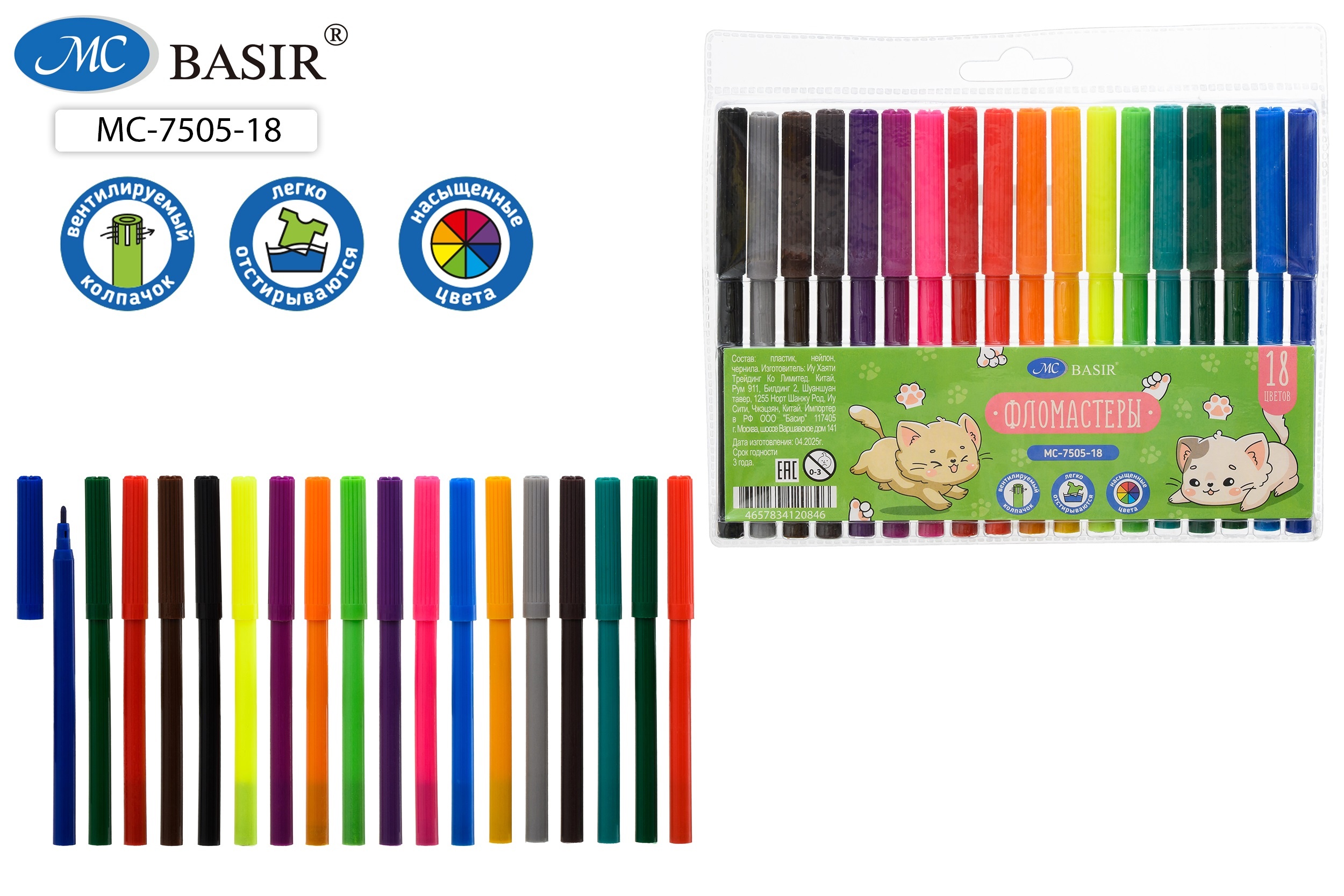Большой набор Basir «КОТЯТА» — 18 цветных фломастеров для творчества и рисования. Удобная форма, яркие оттенки и безопасные чернила.