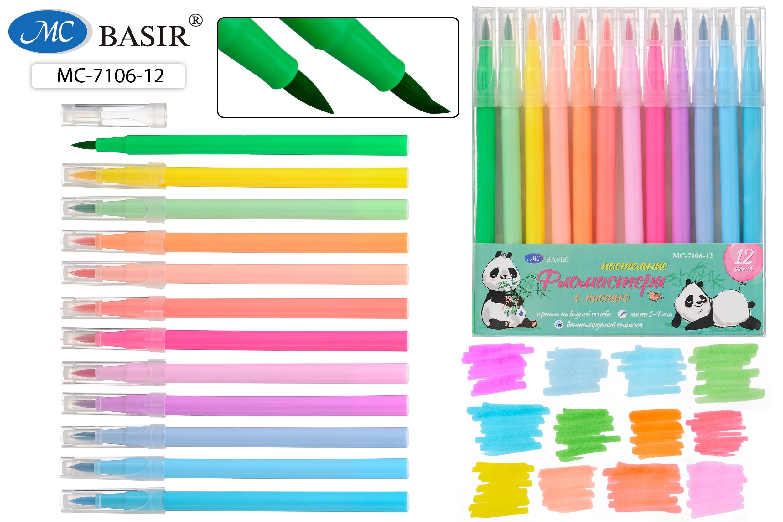 Фломастеры Basir «ПАНДА» — набор из 12 нежных пастельных оттенков. Мягкий кистевой наконечник (1–4 мм) отлично подходит для каллиграфии, рисования и раскрасок. Чернила на водной основе, легко смываются.