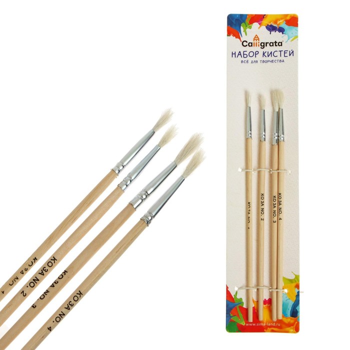 Набор кистей коза круглые 4 штуки (№1,2,3,4) с деревянными ручками на блистере 4725849