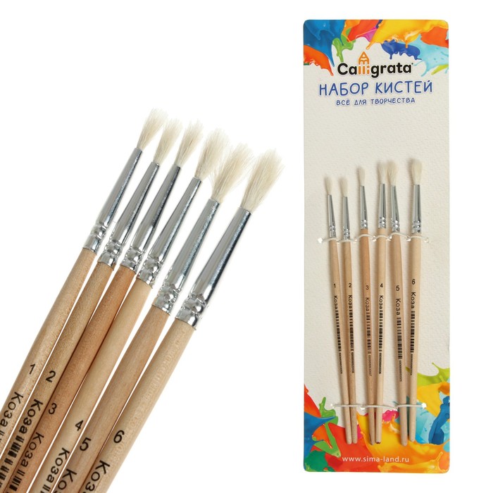 Набор кистей коза круглые 6 штук (№1,2,3,4,5,6) с деревянными ручками на блистере 1503504