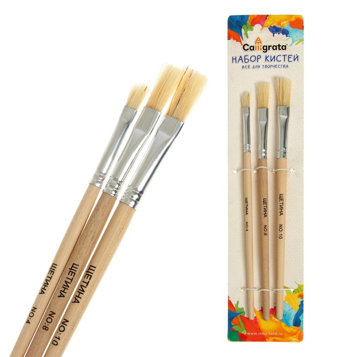 Набор кистей щетина плоские 3 штуки (№4,8,10) с деревянными ручками на блистере 550169