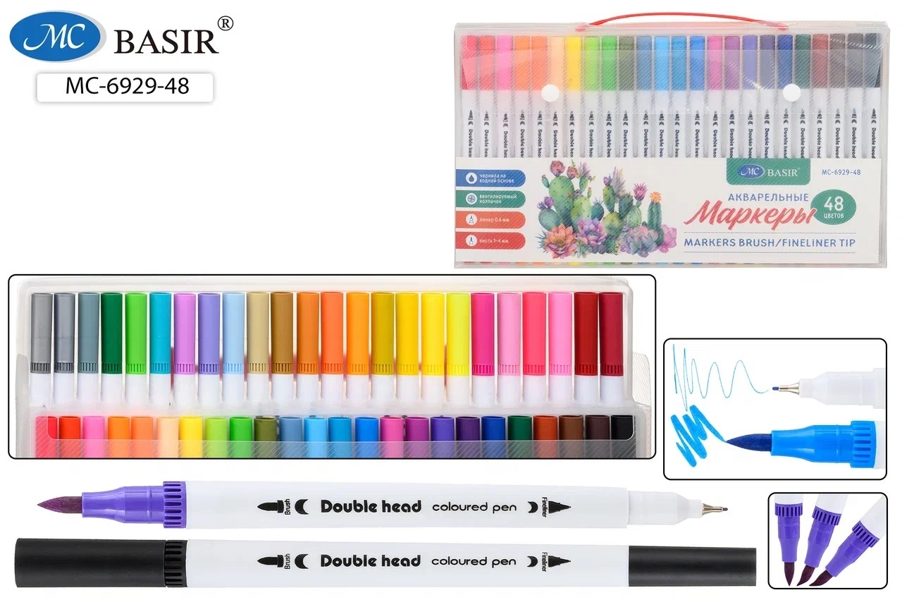 Акварельные маркеры Basir — 48 насыщенных цветов. Двусторонние наконечники: тонкий лайнер (0,4 мм) и кисть (1–4 мм). Чернила на водной основе, не токсичны. Отличный выбор для художников и начинающих скетчеров.