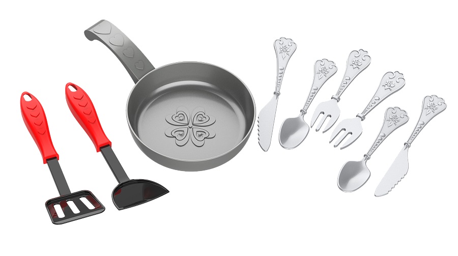 Особенностями набора являются нежная цветовая гамма и шагреневая (шероховатая) поверхность, которые делают игрушки еще привлекательнее для ребенка. Комплектация: сковорода, кухонные принадлежности — 2 шт., ложки — 2 шт., вилки — 2 шт., ножи — 2 шт.