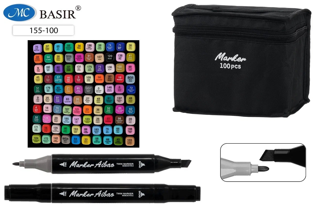 Набор скетчмаркеров: двусторонние, 1,0-7,0 mm; чёрный квадратной формы корпус; на спиртовой основе; тканевая чёрная сумка на молнии, 100 цветов. 071-100