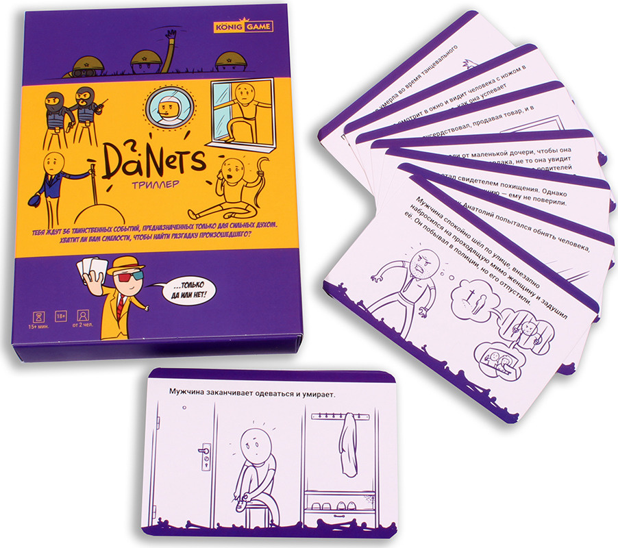Возьмите «DaNets» с собой в кафе, на праздники, в путешествие, и эта игра отлично скрасит время, где бы вы ни были. Игроки выбирают ведущего, он берёт одну карточку, читает на лицевой стороне загадку или условие, а остальные должны угадать историю, задавая ему вопросы, на которые можно ответить только «да» или «нет». Ответ указан на обороте карточки и известен только ведущему.
