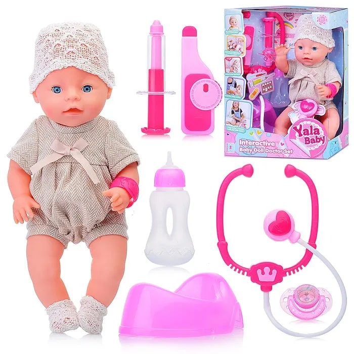 Аксессуары: пустышка, бутылочка, горшок, шприц, градусник и стетоскоп.