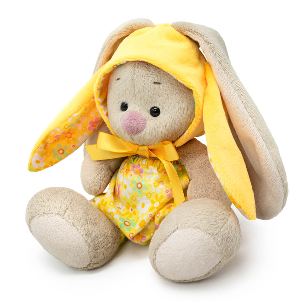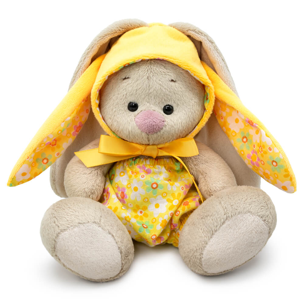 Малышка Зайка Ми в очень трогательном костюмчике кролика. Мягкая шапочка с длинными ушками из софта цвета яичного желтка и ситца в цветочек. Шапочка завязывается на желтую атласную ленту. Также в комплекте шароварчики на резиночках из набивного ситца в желтых тонах.