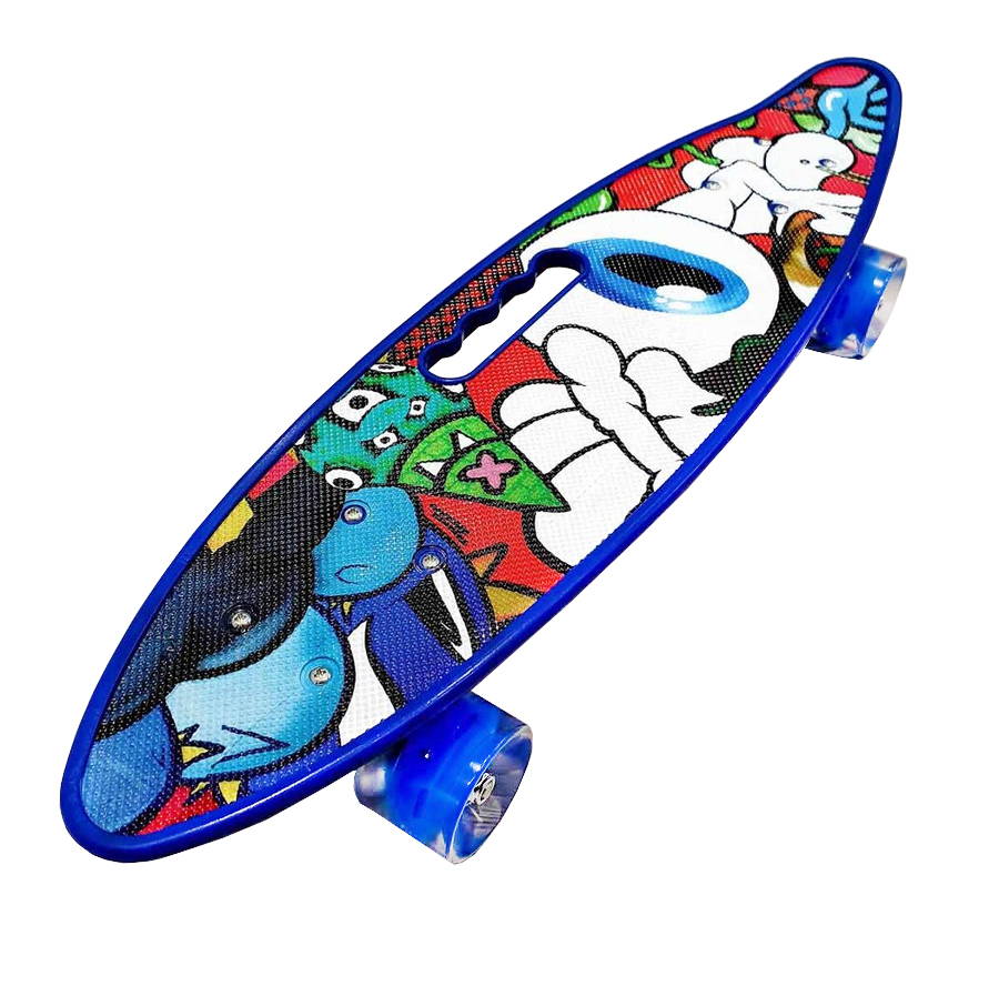 Скейтборд имеет мягкие и широкие светящиеся колеса с 4 разноцветными светодиодами, диаметром 55 мм. Полупрозрачные колеса выполнены из полиуретана, а подшипникими типа ABEC 7.