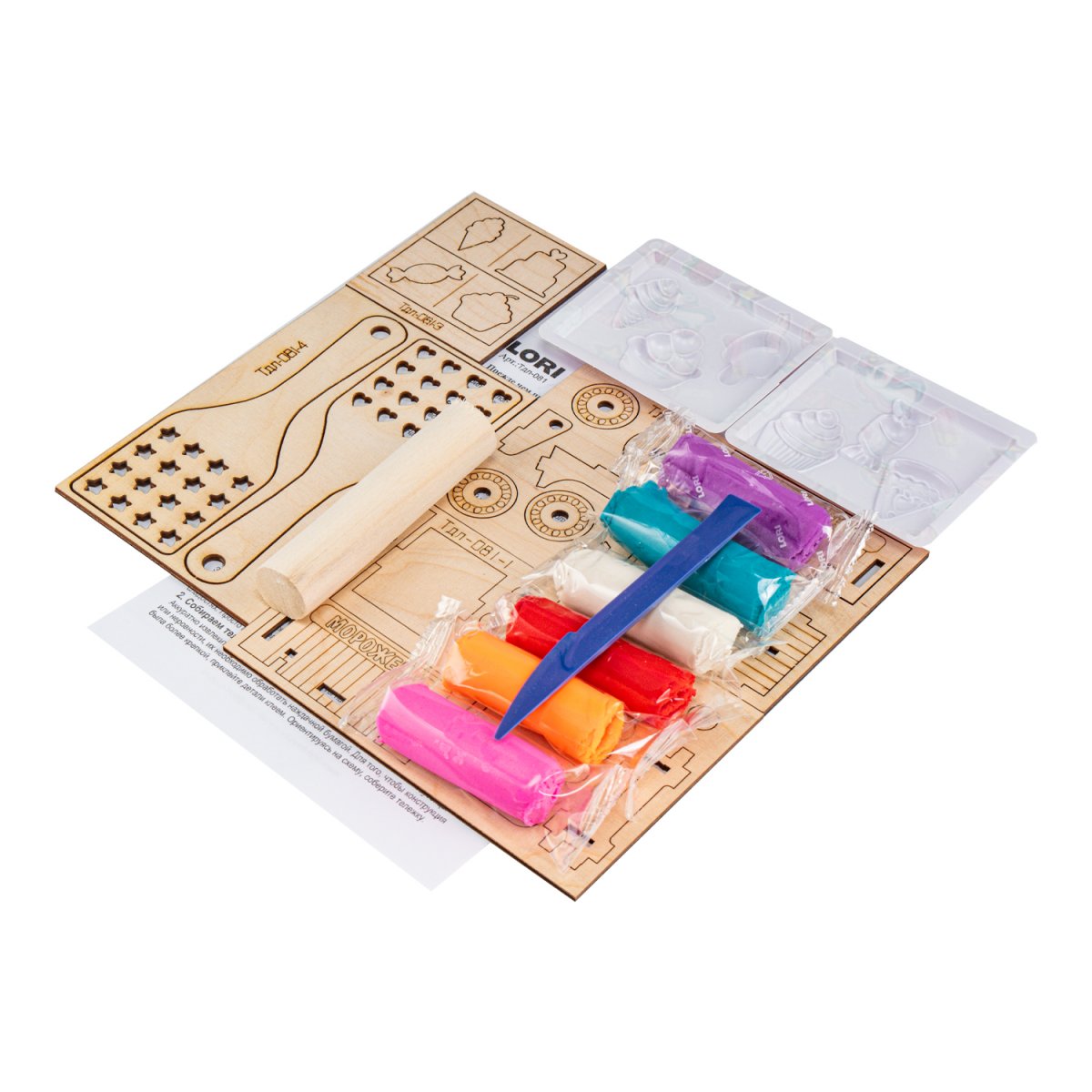 6 цветов, тесто для лепки, формочки, заготовки из фанеры, скалка, инструкция